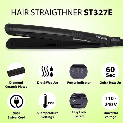 Product Benefits: Hair Straightener Item Shape: Flat Brand Name: BaByliss Hair Type: Thin Material: Ceramic Color: Black Size: One Size Model Name: BaByliss ST327E - Lisor Slim 28mm, Intense Protection Power Source: Corded Maximum Temperature Setting: 235°C |