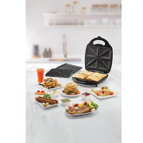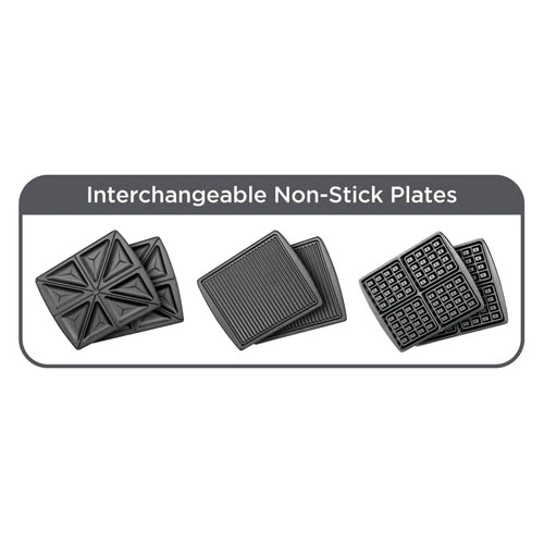 1400 watts of power is ideal for making perfect sandwiches, grilling, and waffles Interchangeable sandwich, grill, and waffle plates for versatile meal preparation Compact design with cord storage for efficient vertical storage 180-degree flat grilling position with a large cooking area suitable for grilling functions Lock-clip button for consistent cooking and safe operation |