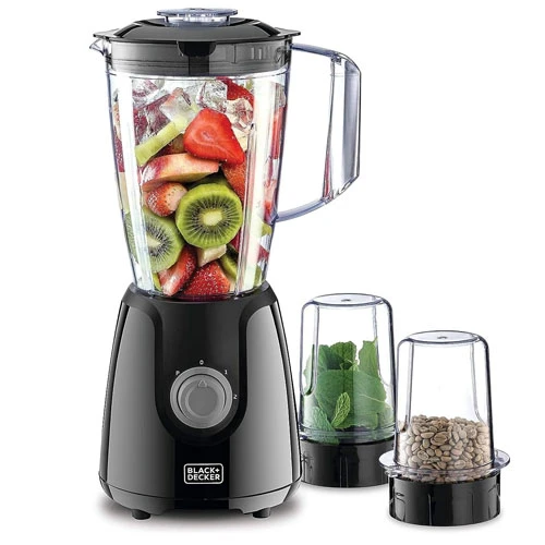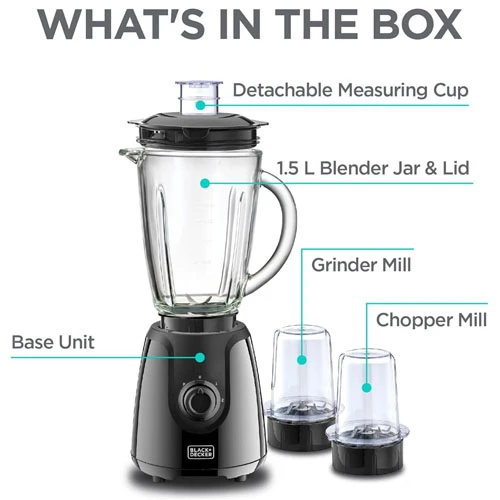 Brand Name: Black & Decker Special Features: Portable 1.5-liter capacity Stainless steel material Included ingredients: [grinder attachment, 2 grinding mills] Style: Modern Recommended uses: Making smoothies, blending soups, grinding coffee or spices, or mixing sauces or dips Power supply: Corded |