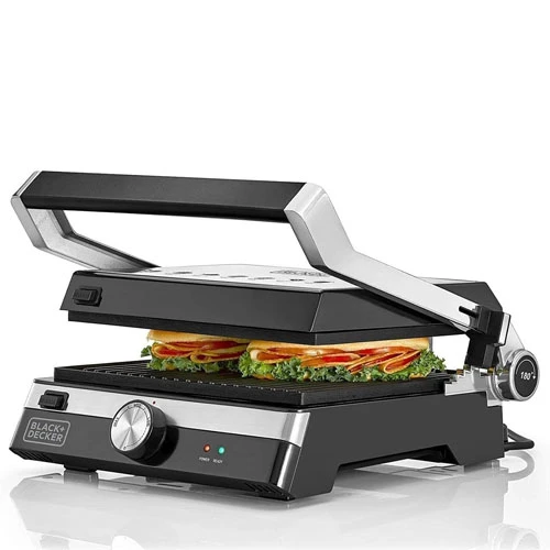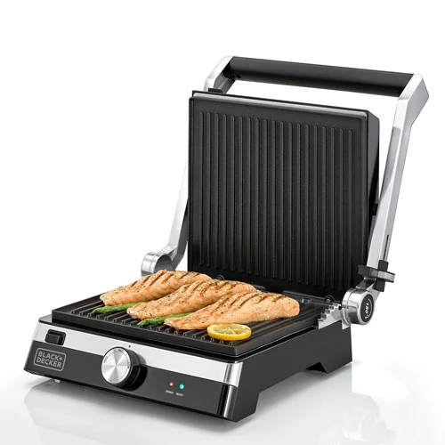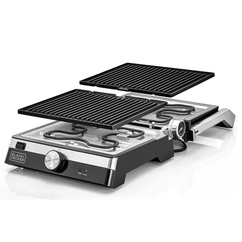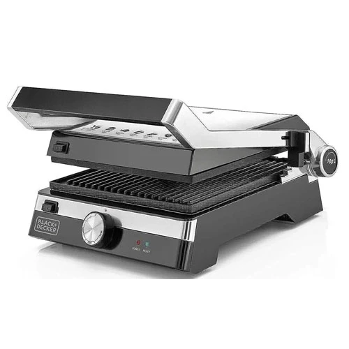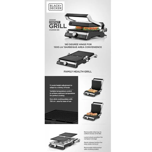 Special Features: Non-stick coating, temperature control Color: Black/Silver Material: Stainless steel Brand: Black & Decker Wattage: 2000 watts Item weight: 3 kg Ingredients included: Recipe booklet Style: Contact Grill Voltage: 2.2 E+2 V |