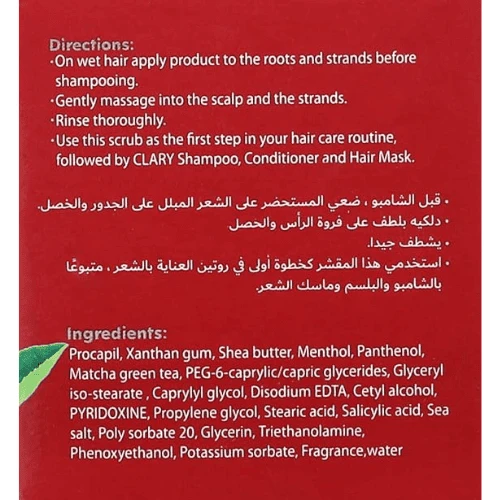 A new generation of luxurious scrub that intensely purifies and exfoliates the scalp, removing unwanted impurities , excess oils, and product buildup. With matcha, rich in vitamins E and C, it helps promote hair growth, nourish, strengthen, and protect strands, reduce oxidative damage from the sun and radiation, and improve blood circulation, so new growth stays as good as new. With Procapil as an active ingredient, it reduces hair loss by combating aging hair follicles and dormant hair follicles. Clary Procapil works to keep hair follicles nourished and healthy so your hair strands don't become brittle. With salicylic acid, an effective ingredient for treating dry skin and scalp conditions such as dandruff. How to use: 1. Before shampooing, apply the product to the roots and ends of wet hair. 2. Gently massage it into the scalp and hair strands. 3. Rinse well. Tip: Use this scrub as the first step in your hair care routine, followed by shampoo, conditioner, and hair mask. Contains: Procapil, Matcha, Sea Salt, Vitamin B6, Menthol, Shea Butter, Salicylic Acid, Water |
