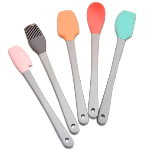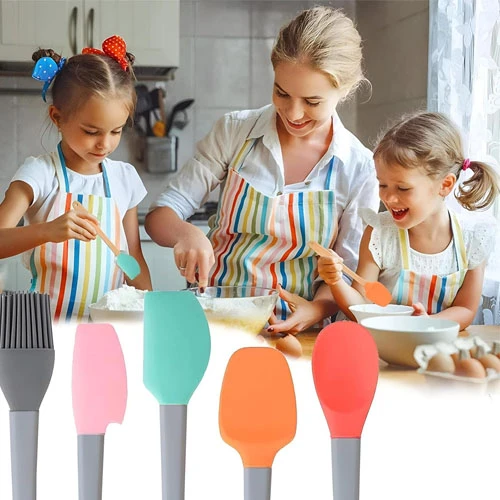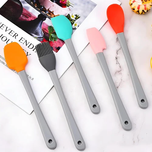 The silicone cooking tool set includes 5 pieces total, featuring a pink spoon, green spoon, gray oil brush, orange scoop and a red spoon. This variety of colors not only adds a fun touch to your kitchen, but also offers you enough tools to handle different cooking tasks efficiently.