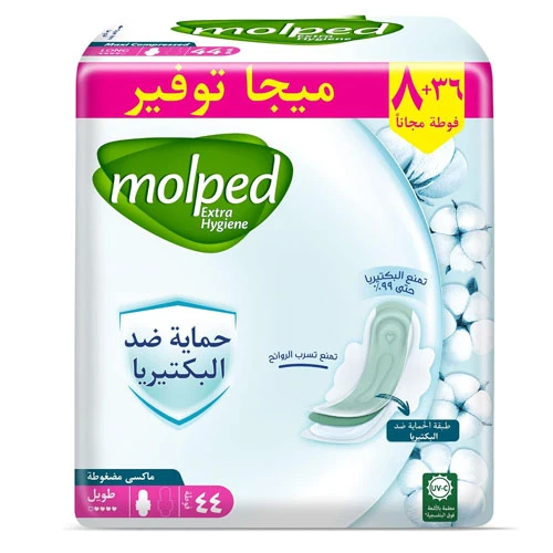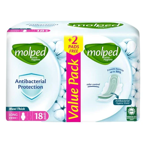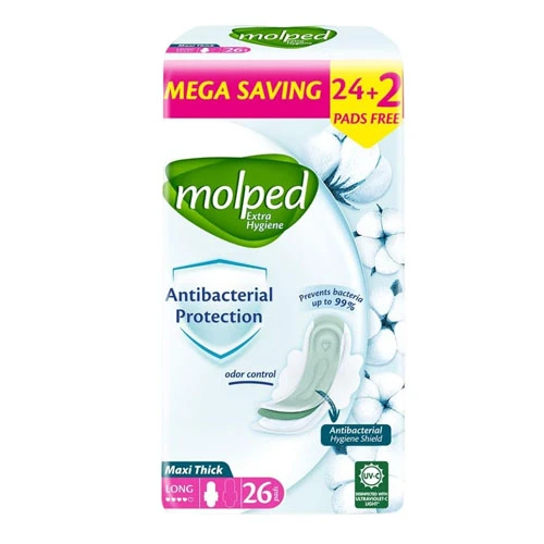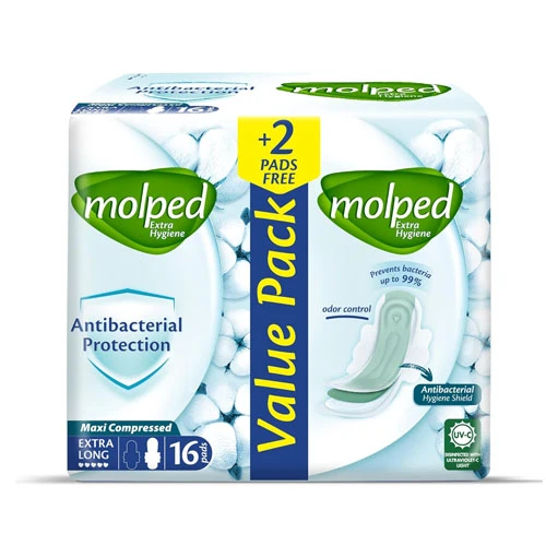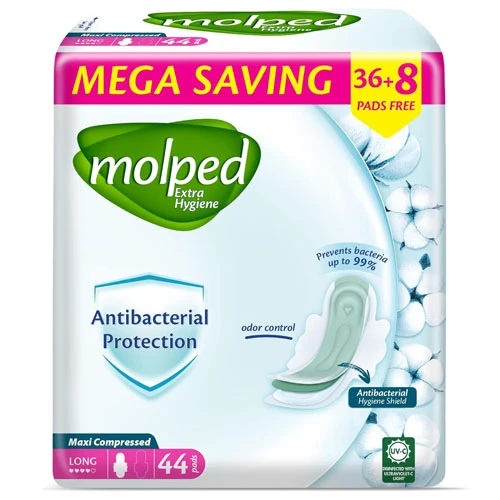 Antibacterial sanitary pads. With the antibacterial Green Clean Shield, they prevent 99% of bacteria from growing on the pad's surface. They control odor and prevent unpleasant odors, and are scented to keep you fresh all day long The pad offers the perfect thickness to balance high absorbency and comfort The pad features an ultra-soft surface to prevent irritation |