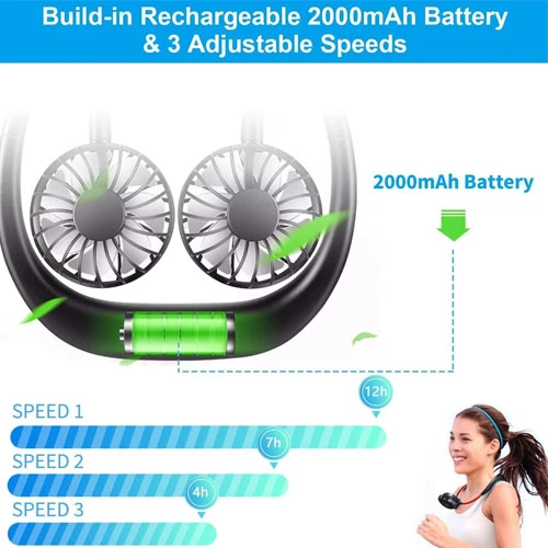 【USB Charging Personal Small Fan】 - Wearable fan has built-in 2200mah lithium battery, which can be quickly charged by USB.It can work for 3-11 hours after fully charging, so you can enjoy the cool breeze of the whole afternoon.You can charge using multiple sources such as a wall charger, computer, power bank, and car charger. Don't worry about the sultry heat caused by power outages in summer!