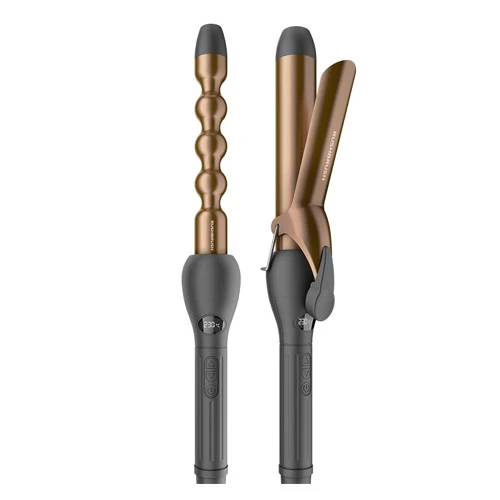 Product Benefits: Shine Boost, Heat Protection Item Shape: Barrel Brand Name: Rush Brush Hair Type: All Material: Tourmaline-Rich Ceramic Color: Bronze Model Name: RB-3 in 1 Curling Iron - Bronze Power Source: Corded |