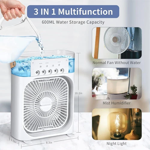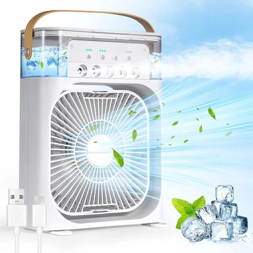 【Cooling and Humidifying Fan】Our 3 in 1 desktop fan is different from all the familiar fans, it features a 5-spray design and 3 fan power and efficiency settings that delivers a stream of cool air where you need it. Just fill the tank with cold water, or add some ice, the air conditioner's function is to help cool the air and make your room cool. Cool the air in seconds in a hot kitchen or living room Living room, home, or office. You can also control the wind direction up and down within a 120-degree range to create a safe and cool zone. 【Low Noise, 3 Speed Levels, and Timer Function】The cooling fan offers you an exclusive way to control the noise when operating, so it won't disturb you whether you're working or sleeping. It's the best Portable cooling fan for hot summer! The portable cooling fan also has 3 wind speed levels (low - medium - high) and a 60-degree oscillation angle to customize the air direction to keep you cool |